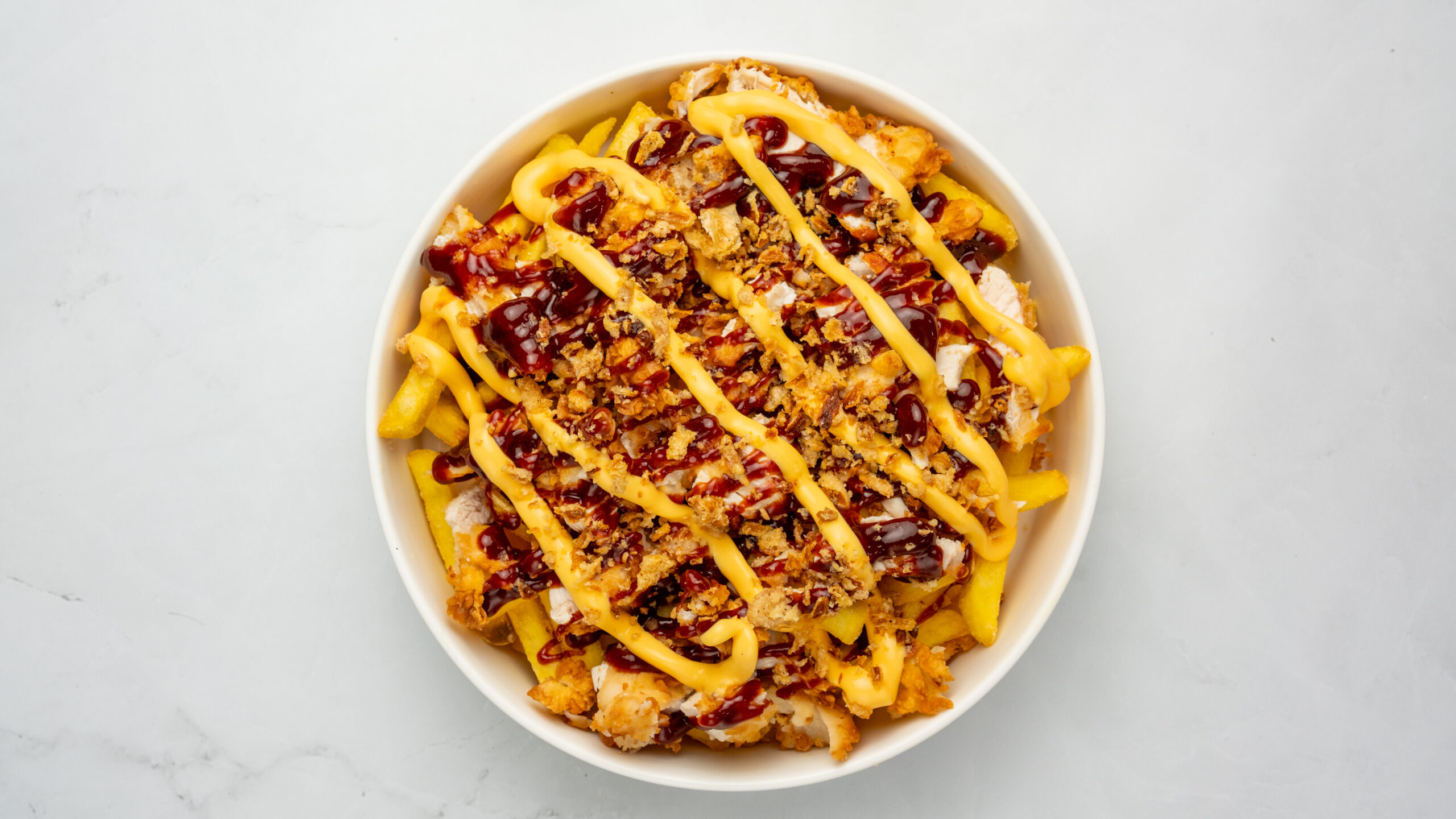 Fries, Chicken, BBQ Sauce, Cheese sauce, Fried onions