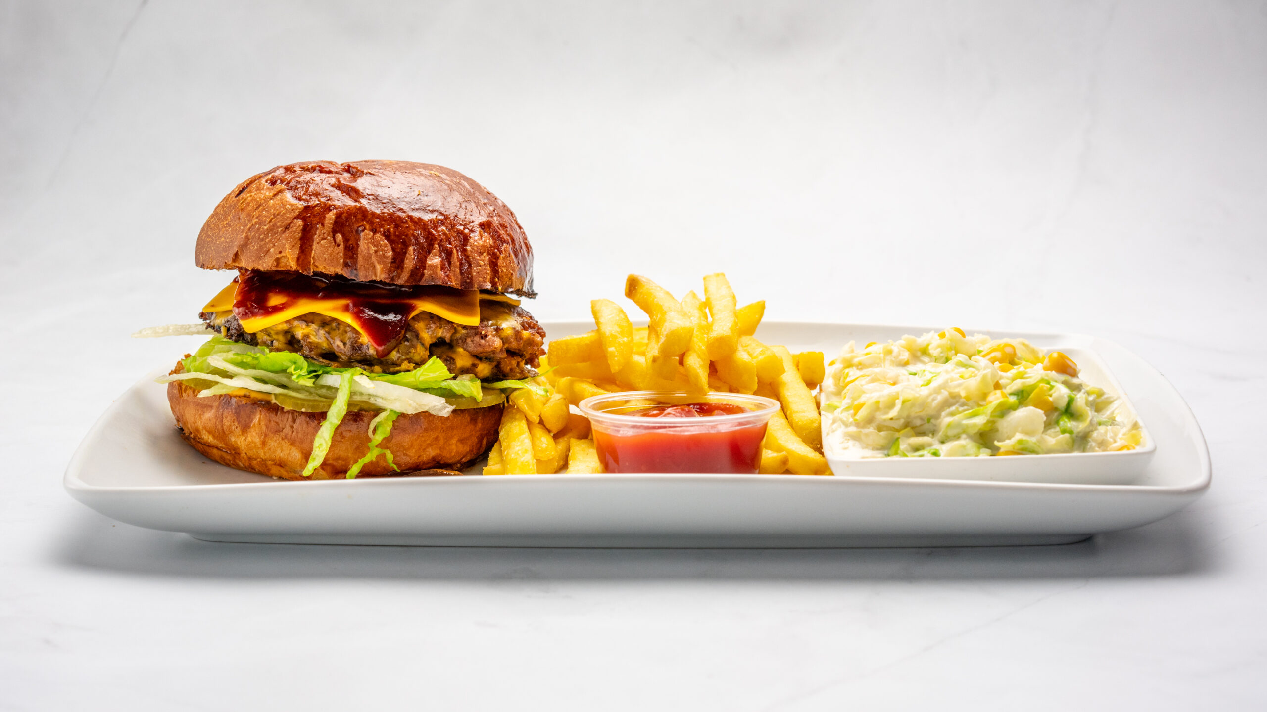 BBQ Smash, Fries, Sauce, Creamy corn Salad
