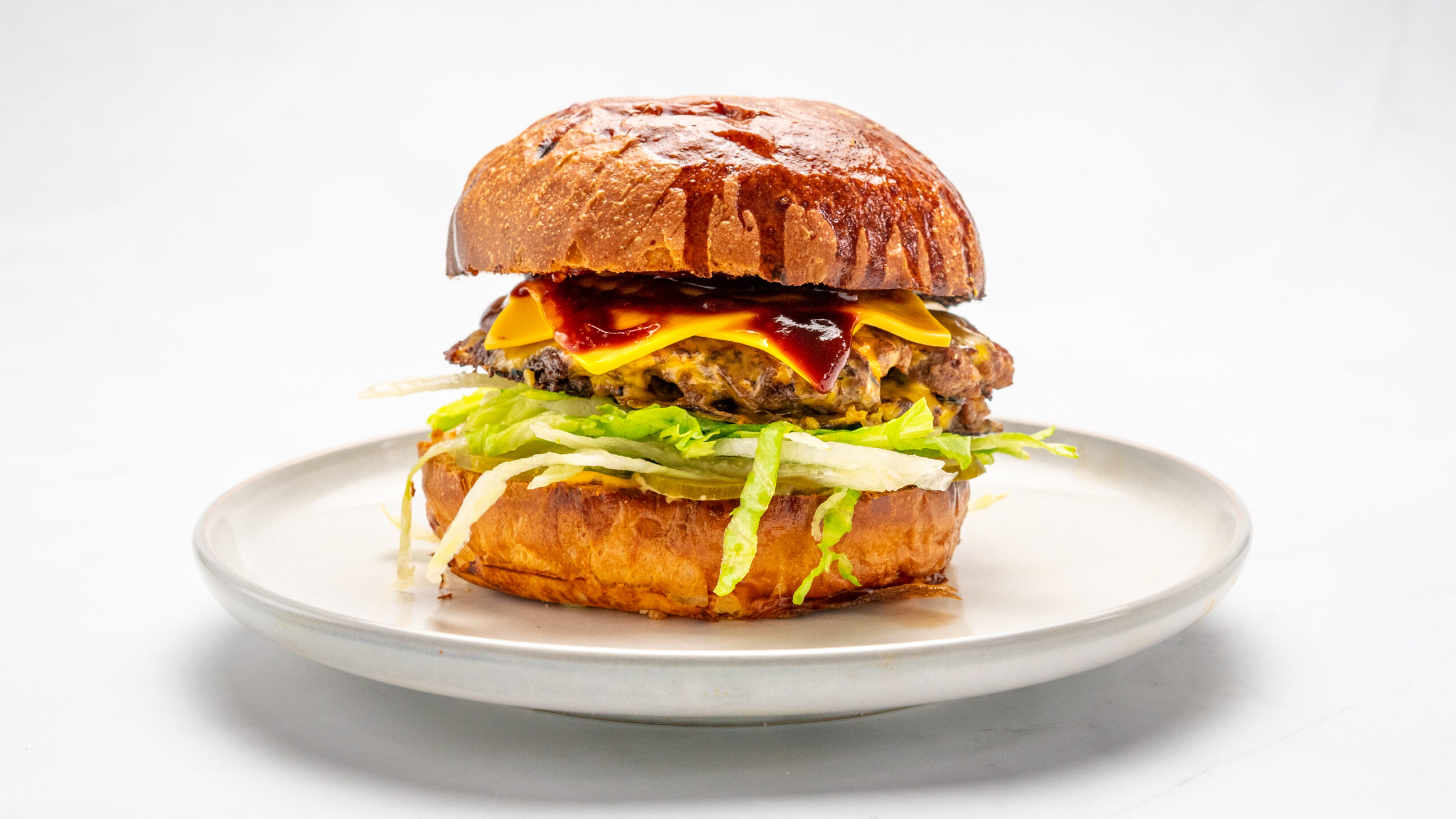 2*Beef Cutlet with smash onion, BBQ sauce, Burger sauce, 4*Cheddar cheese, Fried onion, Pickle, Lettuce