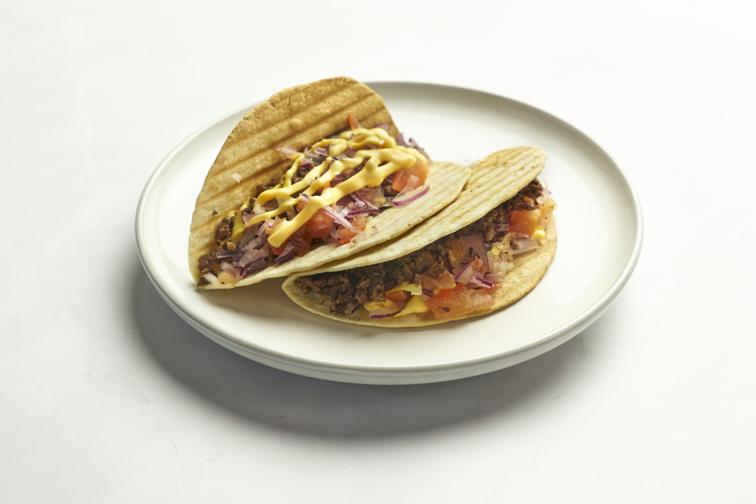 Tortilla, Gilled beef, lettuce, onions, tomato, cheese sauce on top