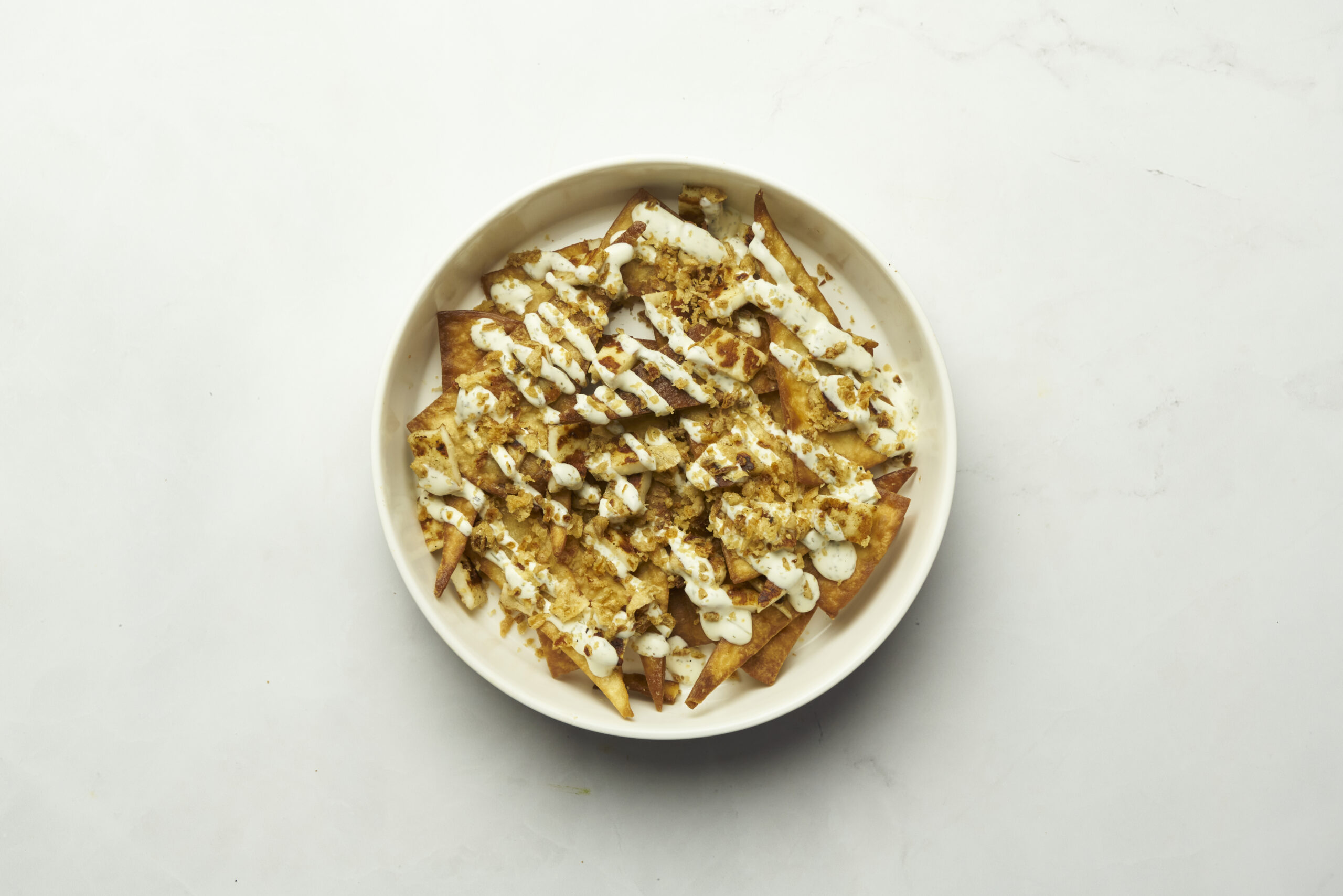 Tortilla chips, grilled halloumi and fried onions with Ranch sauce