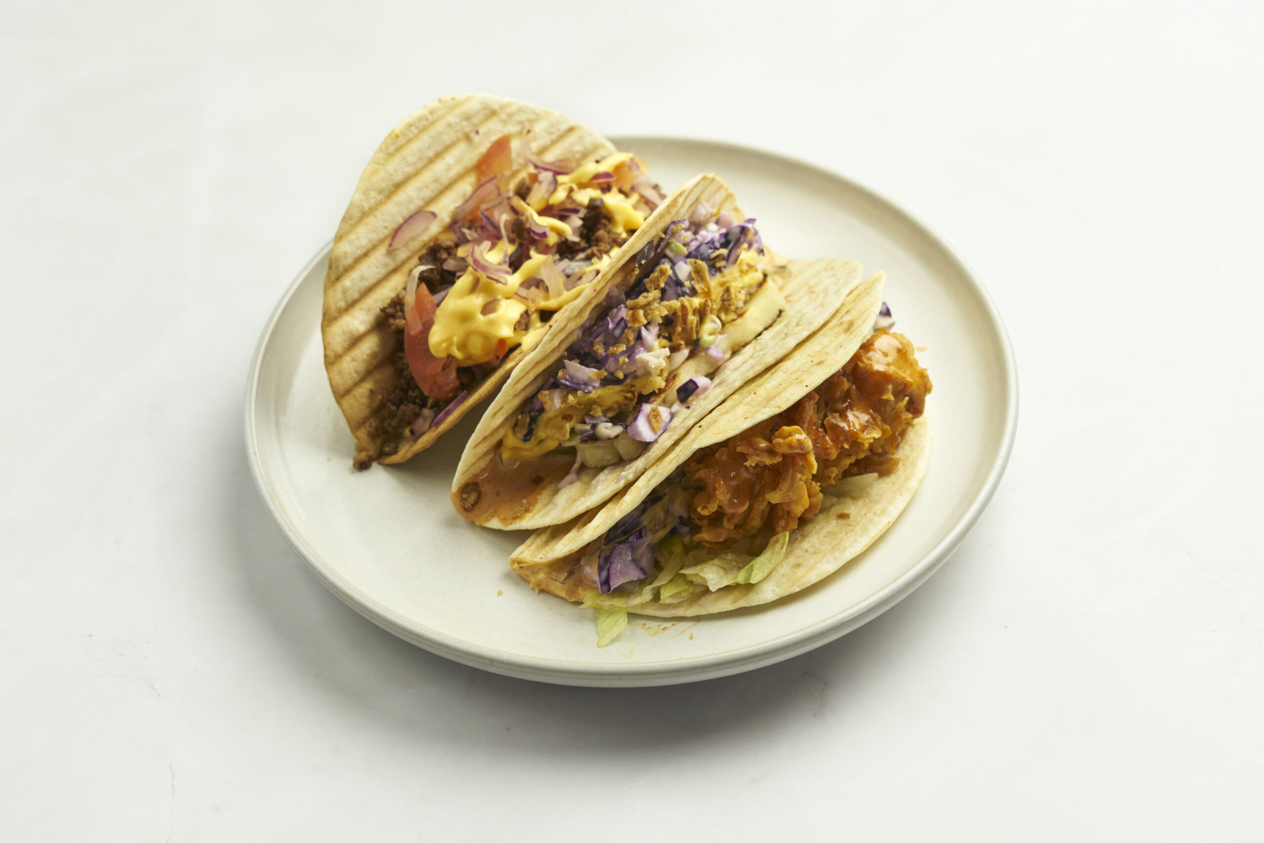 1 Beef taco, 1 Fried chicken taco, 1 Halloumi taco