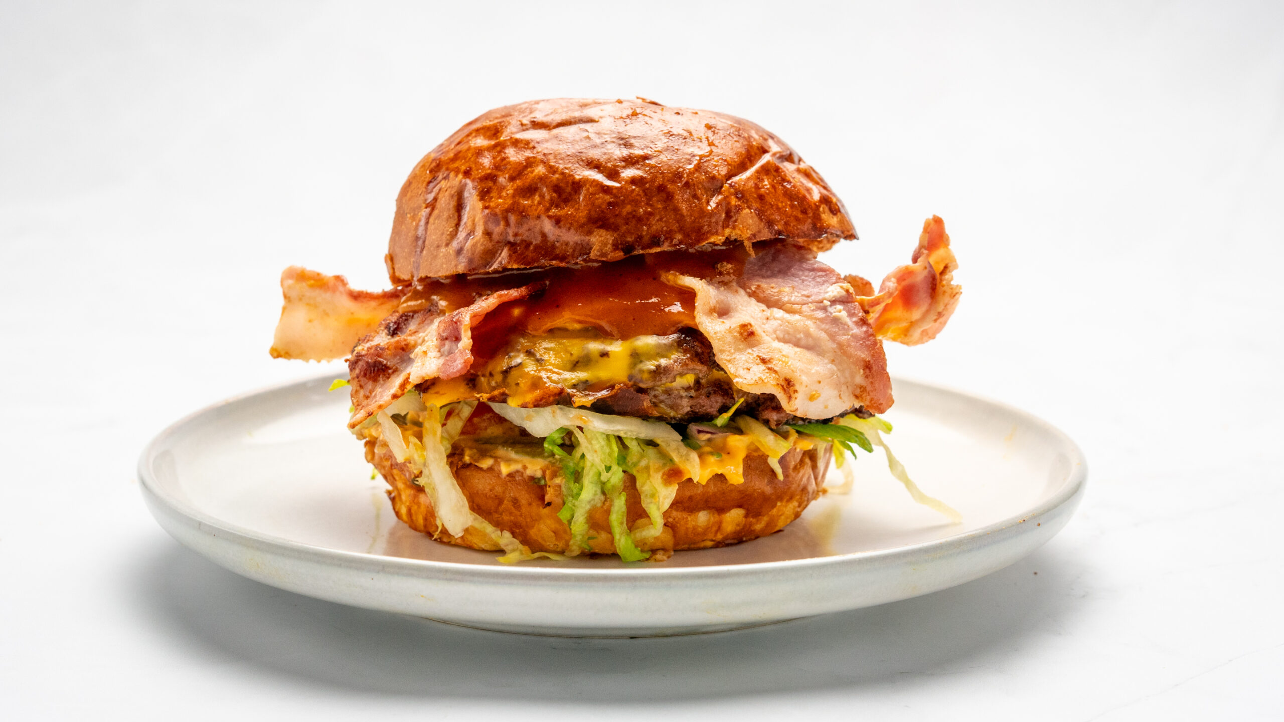 2*Beef Cutlet, BBQ Carolina sauce, Burger sauce, 4*Cheddar cheese, Fried onion, onion, Pickle, Lettuce, Bacon
