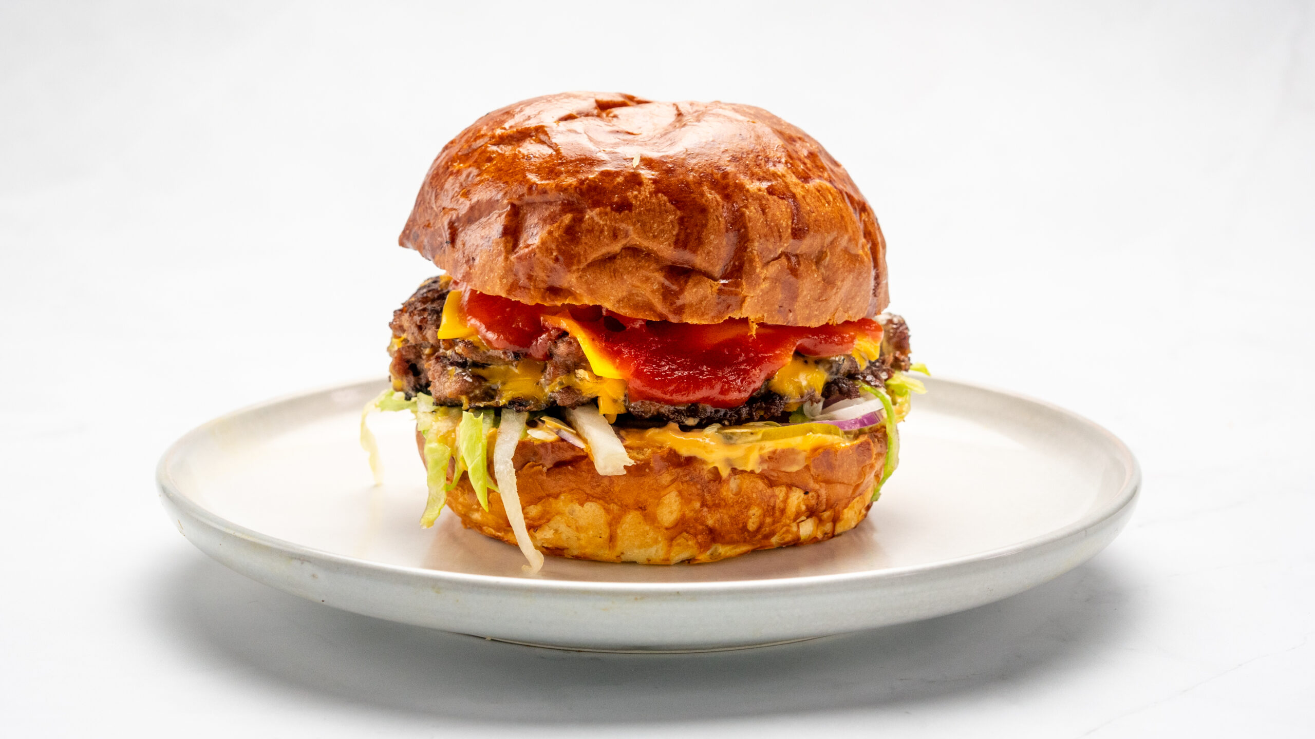 2*Beef Cutlet, Ketchup, Mustard, mayo, 4*Cheddar cheese, Pinch of salt and pepper, Onion, Tomato, Lettuce